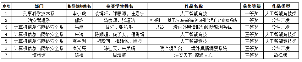 近年来,学院持续强化“学生中心”理念,全面深化创新教育训练改革,积极组织师生参加各类学科比赛,学科竞赛奖项数量质量屡创新高。以上获奖成果反映了学院在加强创新教育、提升师生信息技术应用能力等方面的工作成效,体现了智能教育时代特征。学院将进一步加强创新教育工作研究,努力构建具有公安学科专业特色、以思创融合、专创融合、科创融合、产创融合为主要内容的“四创融合”育人体系,不断提升大学生实践创新能力,推进教学工作高质量发展。