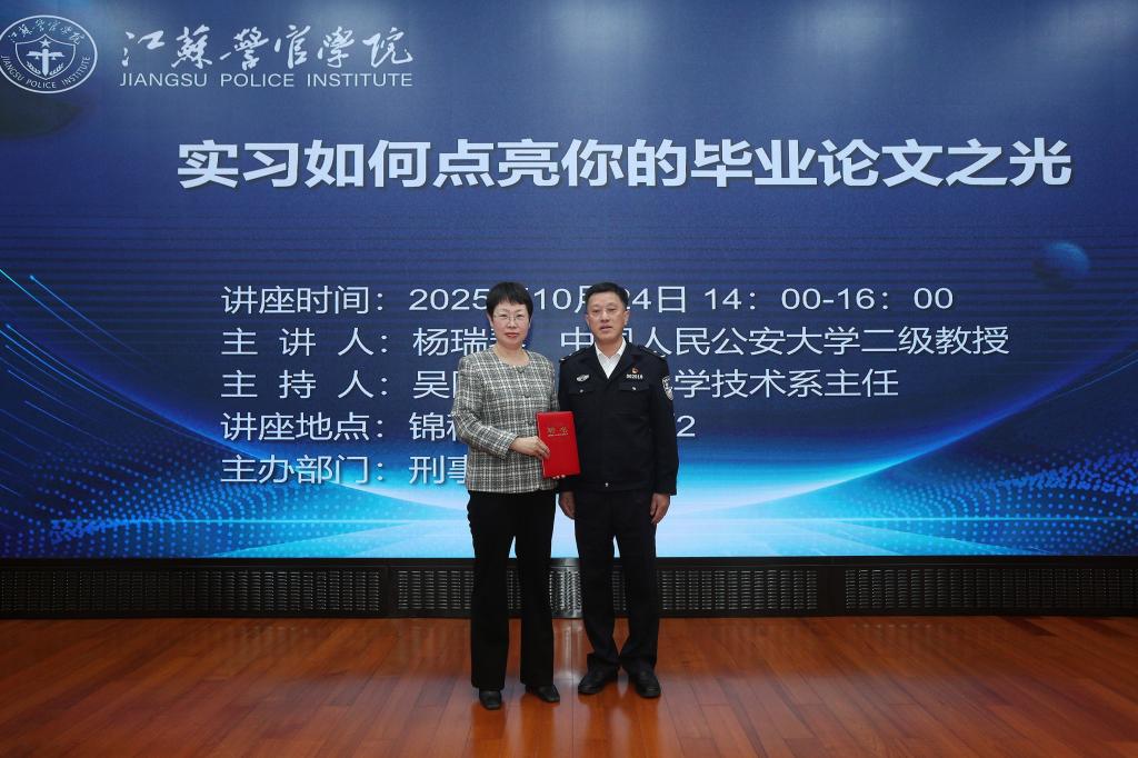 2025年10月24日,中国人民公安大学杨瑞琴教授应邀为刑事科学技术系师生开设“实习如何点亮你的毕业论文之光”专题讲座。学院党委委员、教务处处长缪文升代表学院为其颁发了客座教授聘书。2023级刑技专业全体学生及系部青年教师共260余人到场聆听。