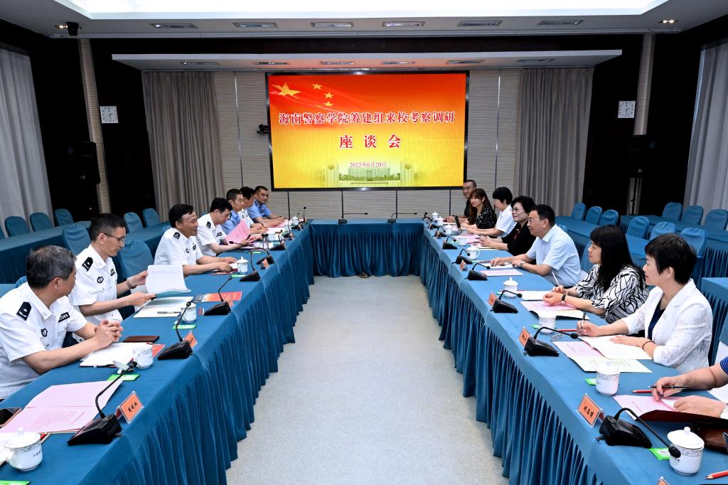 6月19日,海南政法职业学院党委书记庄才德率海南警察学院筹建组一行来校调研交流。我院党委副书记、院长黄进,党委委员、副院长韩德明出席相关活动。海南政法职业学院副院长王春霞、海南警察学院筹建组专家傅冰钢、海南政法职业学院党委委员郑红瑾和两校相关部门负责人参加交流活动。