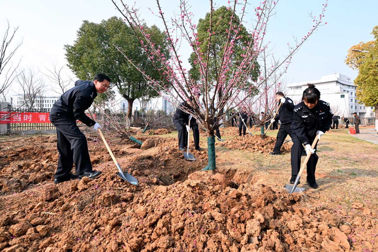 春风扑面辞冬去,红梅花开迎春来。时逢我国第46个植树节,3月12日上午,学院开展以“建设美丽警院 实现绿色发展”为主题的植树活动。省公安厅党委委员、学院党委书记夏存喜,学院党委副书记、院长黄进与在校院领导、各部门负责人共同在浦口校区参加义务植树活动。