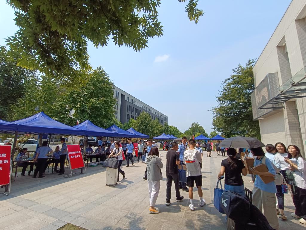 报到现场,迎新氛围浓重热烈。各教学院系和学生大队以及学生社团在图文广场集中迎新点为新生准备了丰富多彩的迎新活动及迎新文创纪念品。