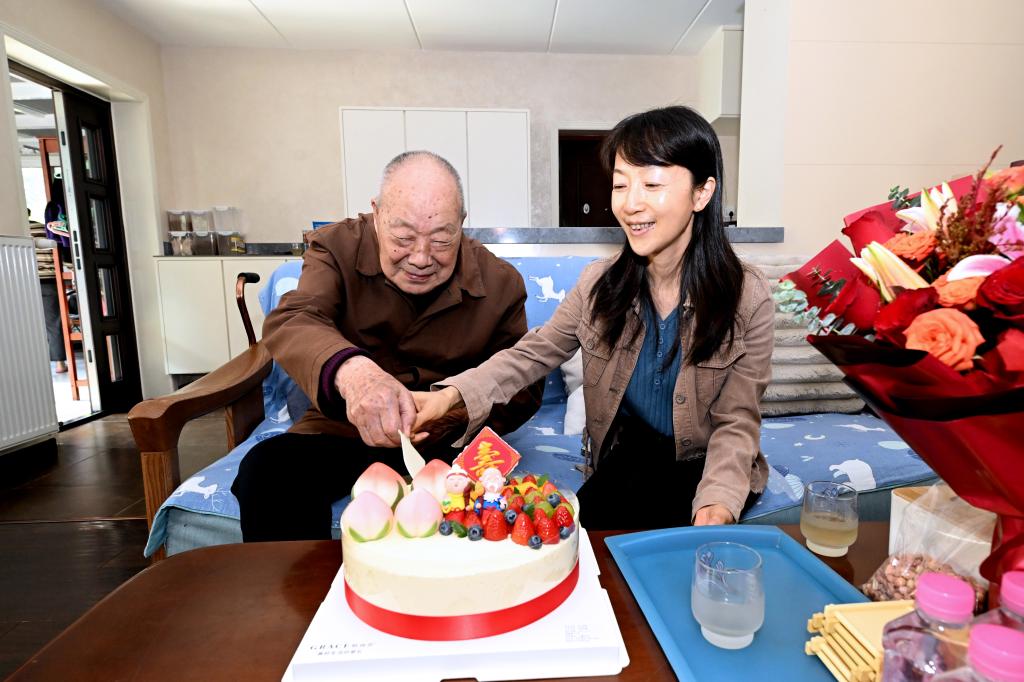 黄进来到百岁老人唐善举家,与老人促膝而谈,了解他的身体健康和家庭情况,感谢他在学院发展中作出的积极贡献,祝福老人保重身体,安享晚年。黄进通报了学院近期发展情况,展示了学院新貌照片,要求相关部门要经常了解老人的生活需求,及时做好服务,并和随行人员一起为唐老师唱起了生日歌,与老人一起分享生日蛋糕,庆祝他的期颐之喜。