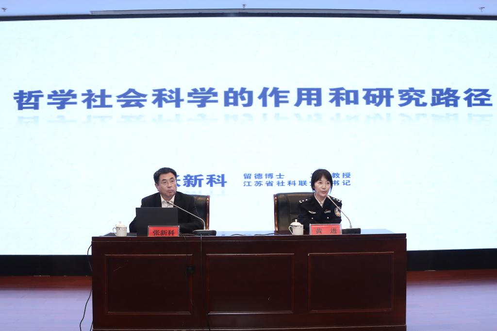 4月19日下午,江苏省社科联党组书记、常务副主席张新科教授应邀来校作《哲学社会科学的作用和研究路径》专题讲座,学院党委副书记、院长黄进主持讲座,科研处、治安系等部门负责人及师生代表260余人现场聆听了讲座。