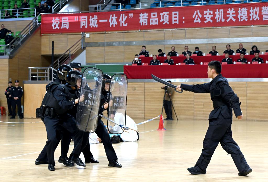 4月26日下午,学院与南京市公安局在浦口校区警体馆共同举办校局“同城一体化”精品项目:公安机关模拟警情处置“红蓝对抗”演练公开课活动。学院党委副书记、院长黄进致开幕词,学院党委委员、副院长刘蔚文主持活动并讲话,山东警察学院党委委员、副院长李亦农出席活动。