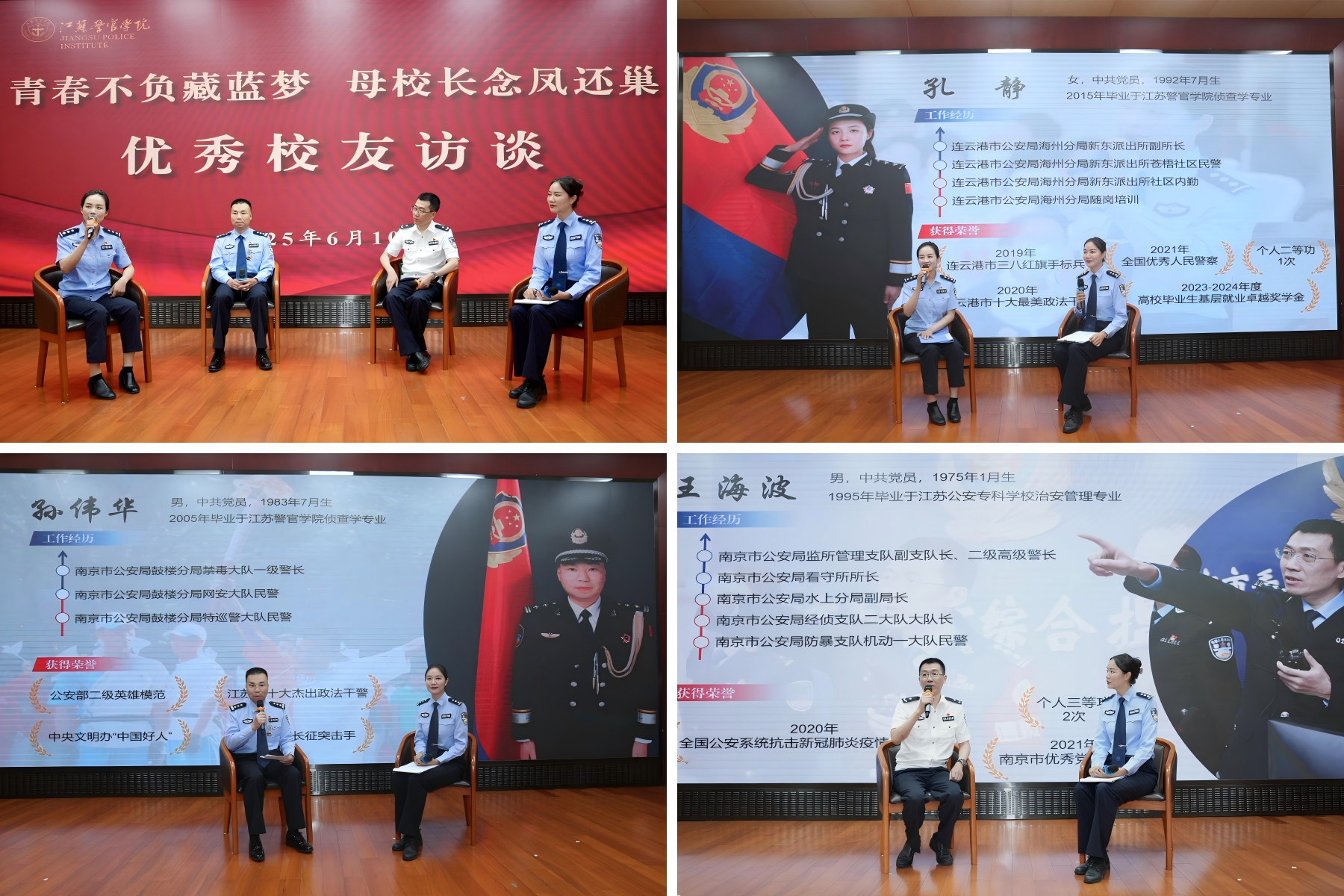 连云港市公安局海州分局新东派出所副所长孔静,南京市公安局鼓楼分局一级警长孙伟华,南京市公安局监所管理支队党委委员、二级高级警长王海波作为校友代表在锦程大厦报告厅参加“青春不负藏蓝梦 母校长念凤还巢”优秀校友访谈活动。