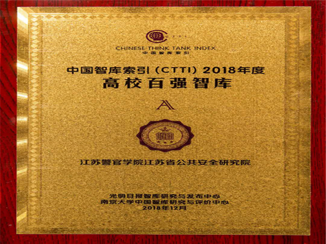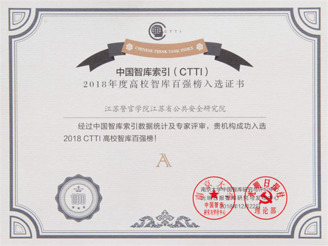 论坛发布了由南京大学中国智库研究与评价中心和光明日报智库研究与发布中心共同研制完成的《2018CTTI智库报告》。截至目前,CTTI共收录智库机构706家。由智库专家组成的评审组从智库产品、智库活动、智库媒体影响和智库专家主观评价四个维度,对收录在CTTI中的441家高校智库进行综合评价,按照分数高低选出100家优秀智库,评为“A区高校智库”,形成“CTTI高校智库百强榜”,其中25家智库被评为“A+”,35家智库被评为“A”,其余40家智库被评为“A-”。江苏警官学院江苏省公共安全研究院入选“中国智库索引(CTTI)2018年度高校百强智库”,被评定为“A”等级智库单位。《2018CTTI智库报告》还将706家国内来源智库分为12个政策研究领域进行专业测评,江苏警官学院江苏省公共安全研究院、公安部现代警务改革研究所均入选法律与公共安全领域智库前十五强,分列第六、第八位。