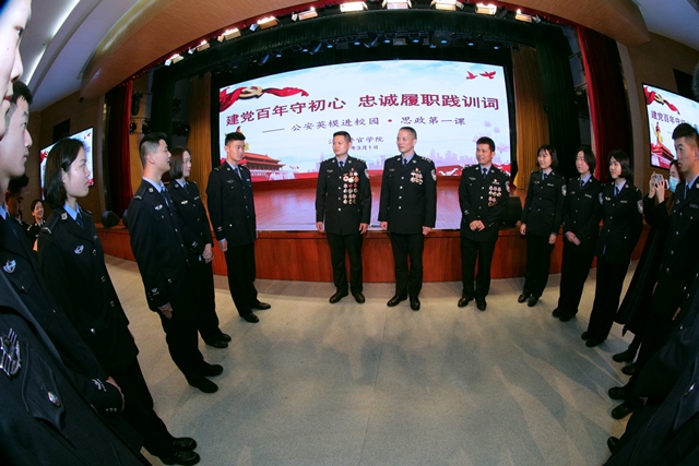 为深入贯彻落实习近平总书记关于思政课建设重要指示精神,扎实推进思政课改革创新,3月1日下午,学院举行新学期“思政第一课”,省公安厅党委委员、学院党委书记夏存喜与来自南京市公安局水上分局的吕宏伟、常州市公安局金坛分局的陆旭东、连云港市公安局刑警支队的张双印等三位公安英模,以“建党百年守初心、忠诚履职践训词”为主题,共同为师生讲授“思政第一课”。