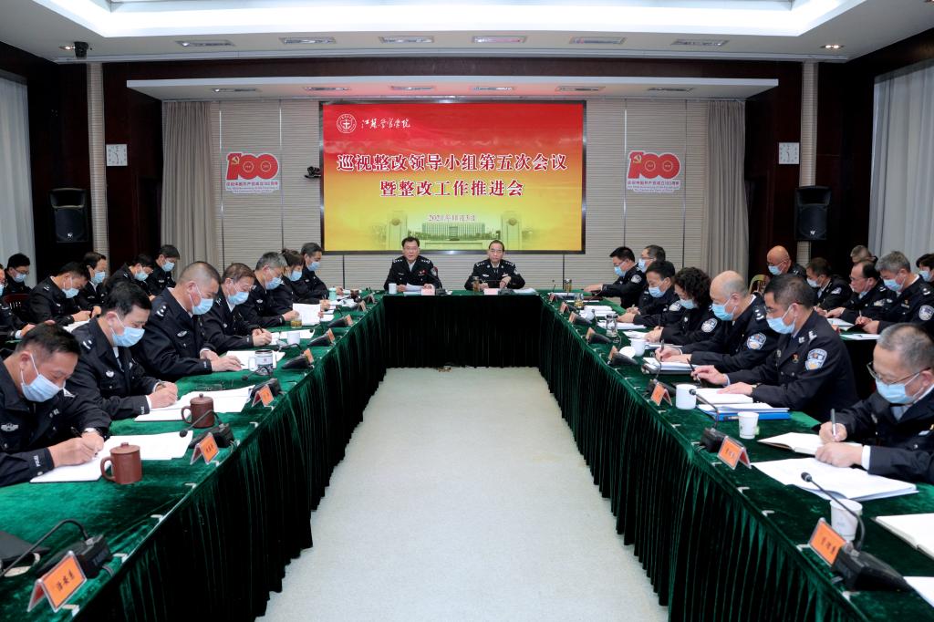 11月3日,学院召开省委巡视整改工作领导小组第五次会议暨整改工作推进会,深入学习贯彻习近平总书记关于强化巡视整改重要指示精神和中央、省委最新部署要求,总结集中整改阶段主要工作,对扎实抓好持续整改进行再部署。省公安厅党委委员、学院党委书记夏存喜主持会议并讲话,强调要站在践行“两个维护”的政治高度,坚持标准不降、要求不变、力度不减,以“钉钉子”精神推进持续整改,确保各项整改任务高质量高标准完成。学院党委副书记、院长张兰青出席会议。