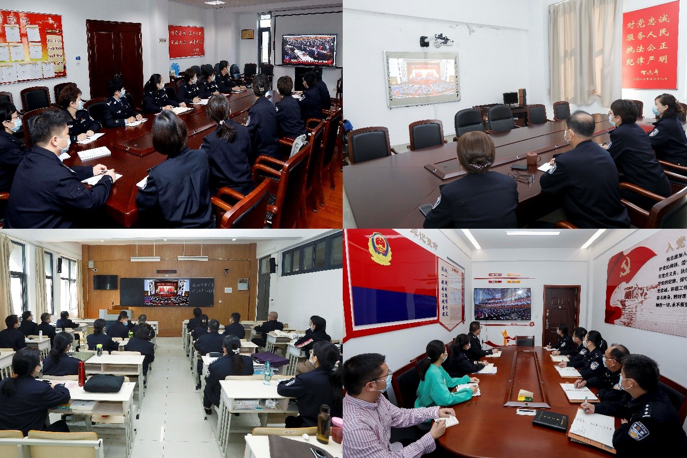 (师生在教室、大数据教学资源服务中心、报告厅、会议室、实验室等场所认真收看大会实况直播)