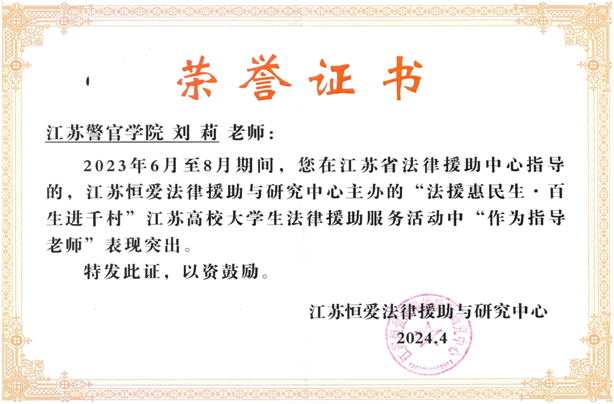 2024年4月10日下午,“法援惠民生、百生进千村”江苏高校大学生法律援助志愿服务活动表彰大会在南京工业大学召开。法律系刘莉老师获评“优秀指导教师”,法律系学生杨世明、张茜被评为“优秀志愿者”。