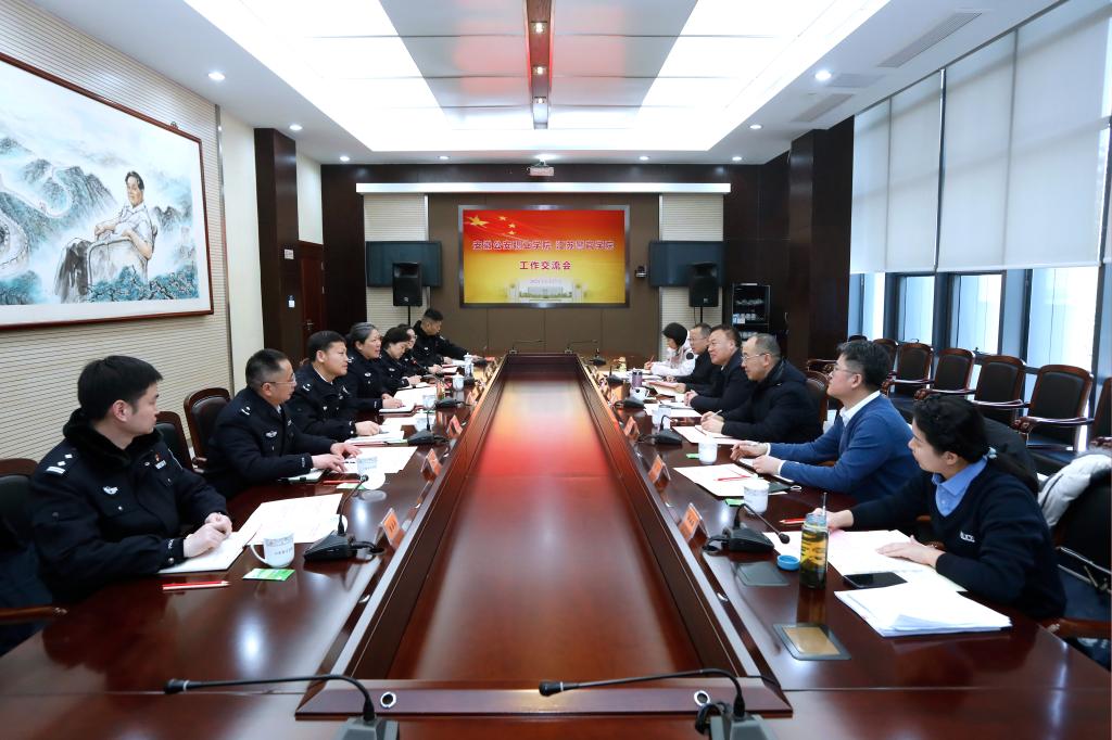 2月27日,安徽公安职业学院党委委员、安徽省公安厅警察训练总队政委吴章学一行6人来我院调研交流。学院党委委员、副院长刘蔚文,政治部主任刘艳芳与调研组一行开展了工作会谈。