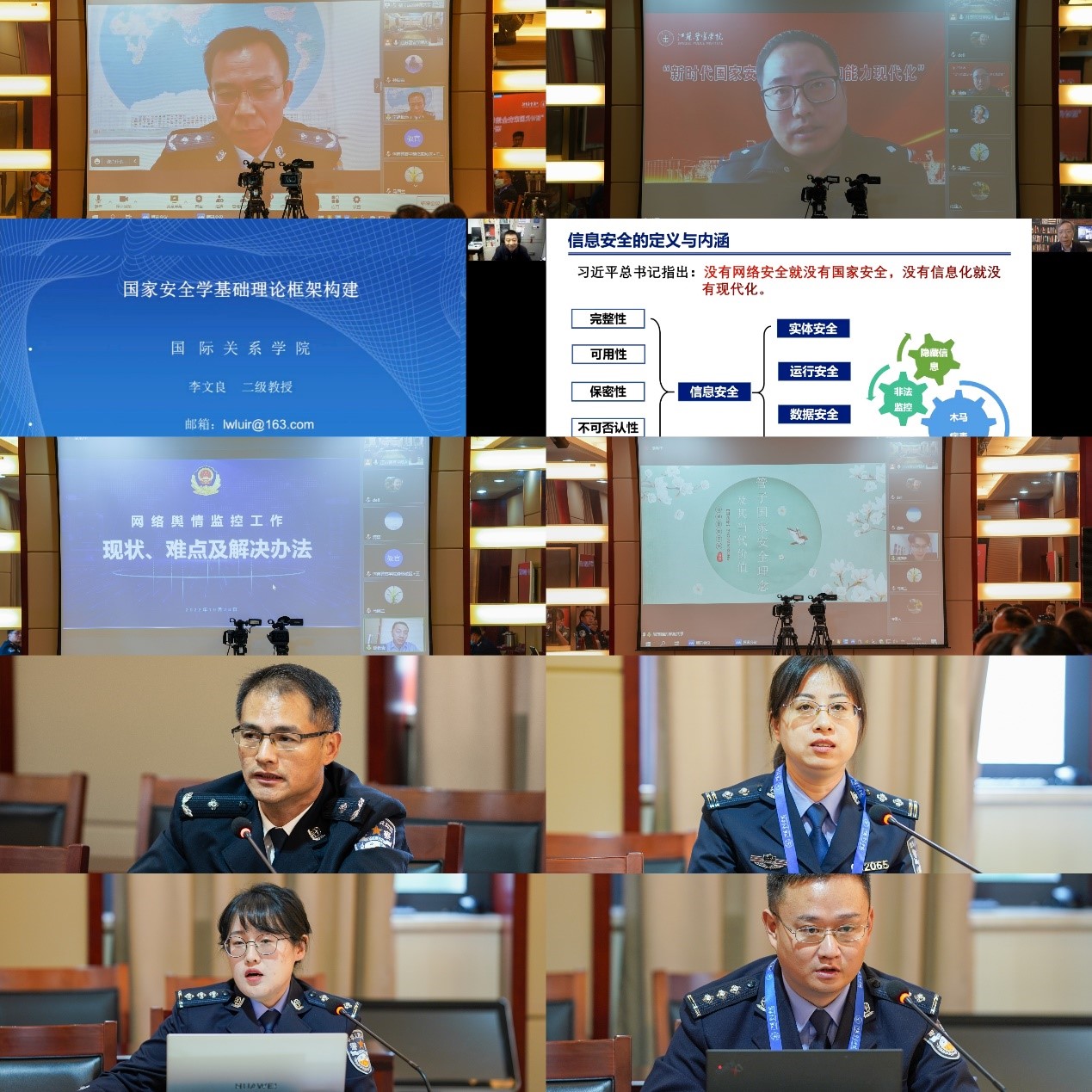 为深入学习宣传贯彻党的二十大精神,2022年10月28日,由江苏警官学院主办、侦查系承办的“新时代国家安全治理体系和能力现代化”研讨会在南京召开。来自南京信息工程大学、南京理工大学、国际关系学院、浙江警察学院、福建警察学院、河南警察学院、南京森林警察学院、江苏警官学院等20余所院校专家学者,以及江苏省公安厅、南京市公安局的实战专家共计90余人通过线上线下的方式参加会议。