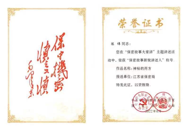 经过省保密局的评审,我院侦查系教师陈伟的作品《神秘的药方》在众多作品中脱颖而出,被省保密局选用并制作成微视频,报送中央保密办(国家保密局)参与评选。经过网络评选和专家评审,陈伟同志在国家保密局组织的“保密故事大家讲”主题活动中荣获“保密故事新锐讲述人”称号。