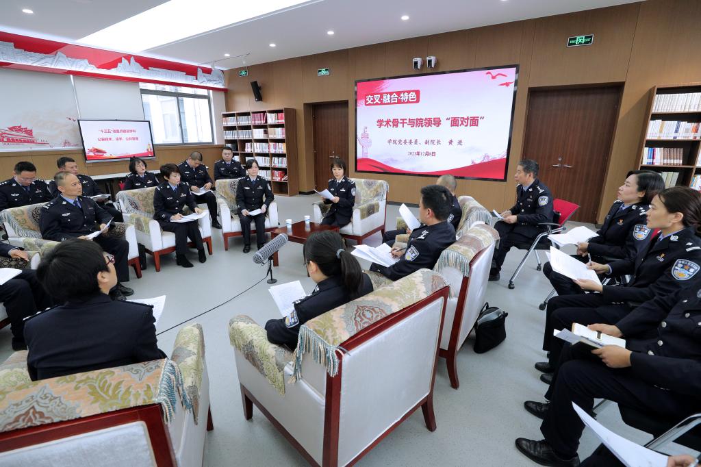 12月8日下午,学院在忠诚警魂教育中心举行“学术骨干与院领导面对面”活动,学院党委委员、副院长黄进与各院系学术骨干代表围绕学科“交叉·融合·特色”主题,分为“凝练学科特色、打造学科品牌”“提升自我、投身学科建设”“提高学科建设水平、推动学院高质量发展”等三个板块进行互动交流。