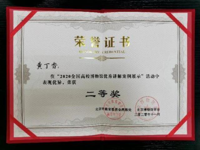 本次活动由国家文物局、中国博物馆协会、北京市教育委员会等联合举办,吸引了41所高校博物馆的108名讲解员参赛,参赛规模和选手水平均创历史新高。经过选手们的激烈角逐,黄丁香同学不负众望,脱颖而出,为学院赢得了荣誉。