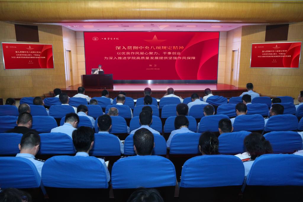 陈卫强调,学院肩负为党育人、为国育才、为警铸剑神圣使命,在学院开展深入贯彻中央八项规定精神学习教育,对于落实立德树人根本任务、推进办学治校高质量发展、应对新征程上的风险挑战具有重大意义。要求全体党员干部认真落实胡彬郴副省长提出的“崇尚极简生活、树立极致作风、践行极严要求”,做到“每天五个一,进步在点滴”。要坚持固本培元,夯实作风建设思想根基;坚持以上率下,发挥“关键少数”头雁效应;坚持实干担当,全面提升办学治校水平;坚持严字当头,保持正风肃纪高压态势,锲而不舍推动中央八项规定精神在学院落地生根、化风成俗,以作风建设新成效护航学院高质量发展。