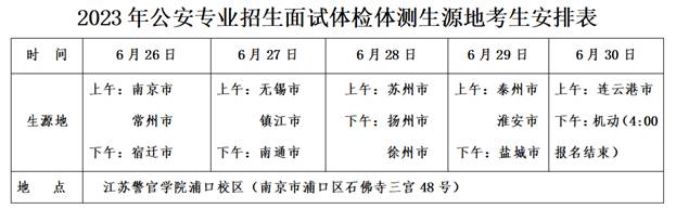 1.面试、体检、体测(以下简称面试)对象为2023年志愿报考中国人民公安大学、中国人民警察大学、中国刑事警察学院、郑州警察学院(原铁道警察学院)、南京警察学院(原南京森林警察学院)和云南警官学院、江苏警官学院公安专业的考生。参加面试考生在高考时须具有江苏省常住户口并在江苏省参加高考,高考成绩达到面试资格分数线(6月25日在江苏省教育考试院公布),首选和再选科目符合各院校招生要求。