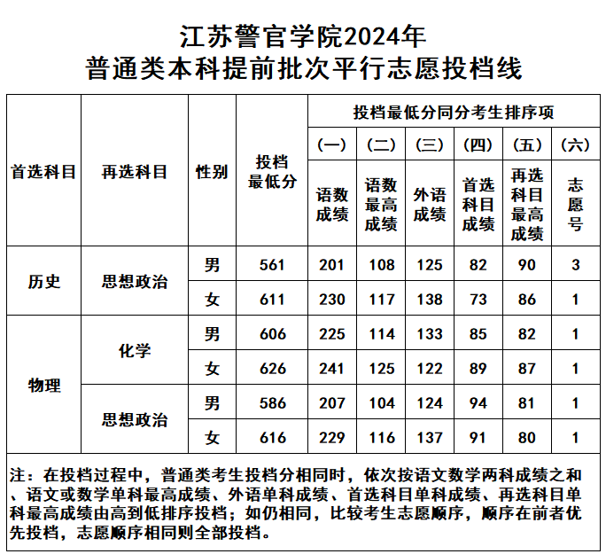 江苏警官学院2024年普通类本科提前批次平行志愿投档线