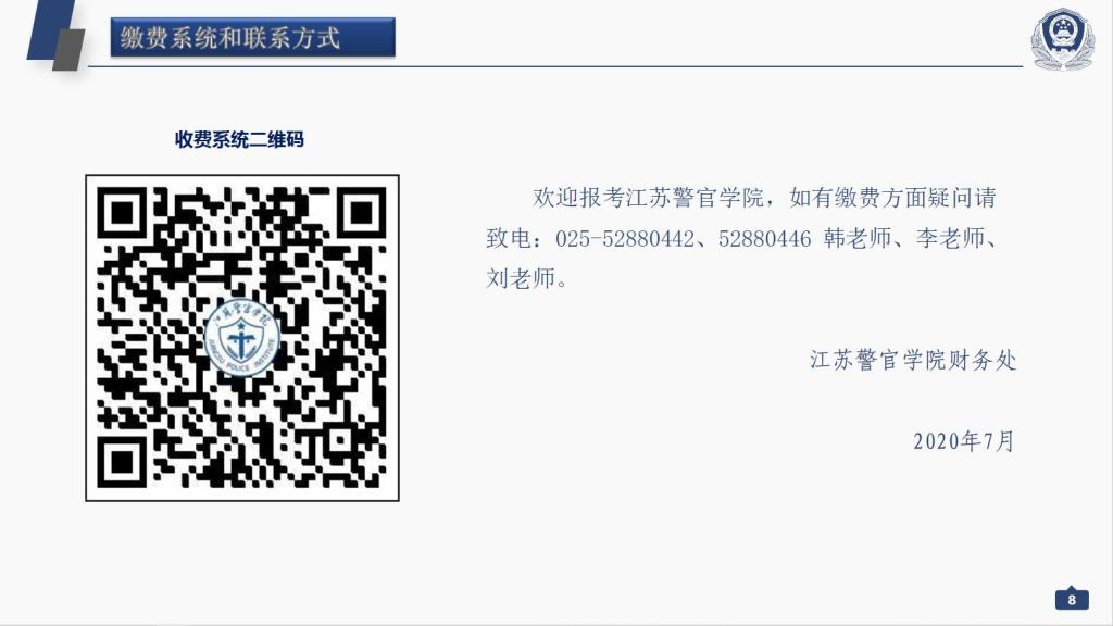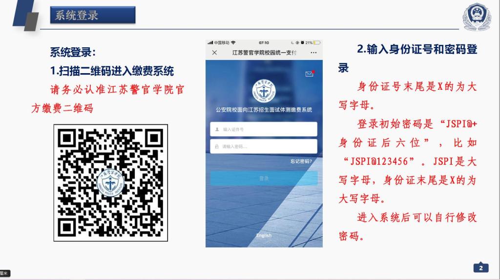 ①预报名的考生通过手机交费,扫描下方二维码进入缴费系统,填写考生身份证号和初始密码(JSPI@+身份证号后六位,如JSPI@123456,JSPI和身份证号末尾是字母的必须大写),登录后点击交费,按提示操作即可,详见《公安院校面向江苏招生面试体测交费操作指南》。