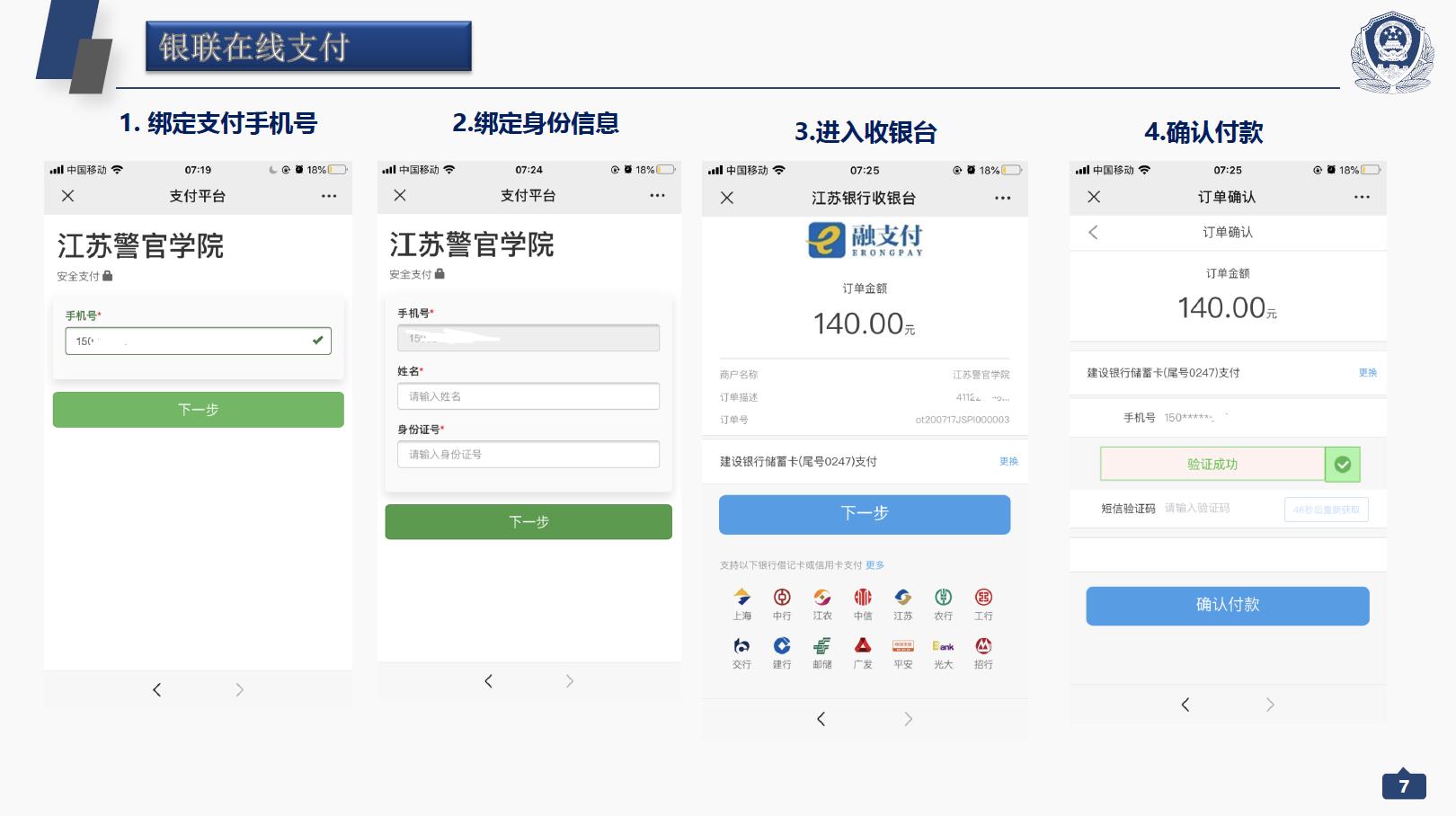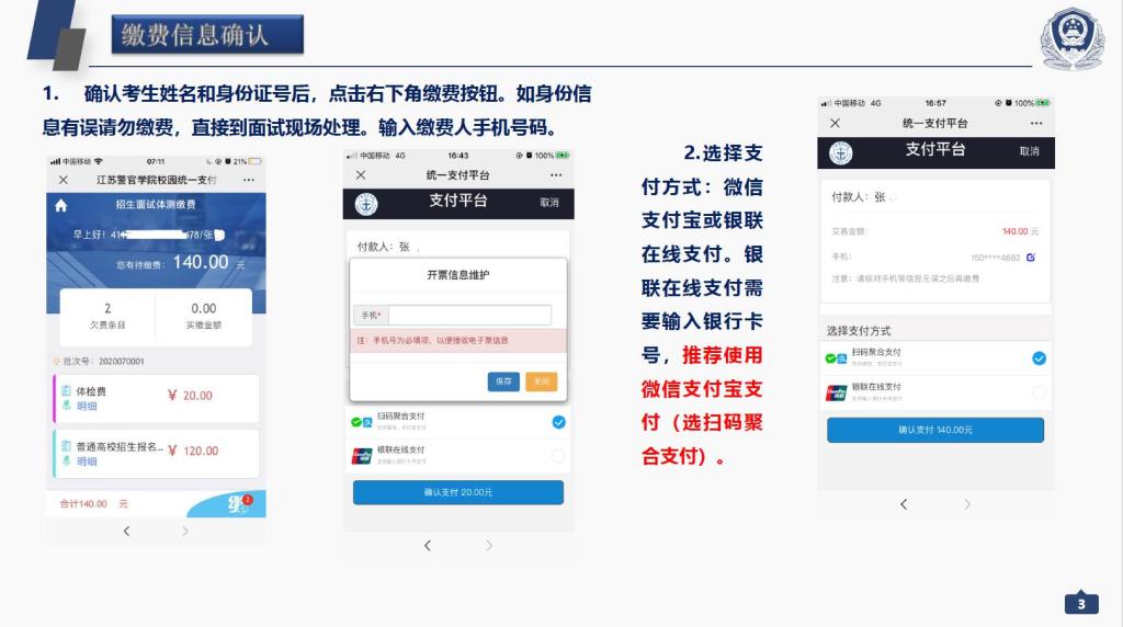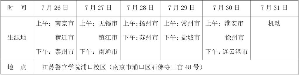 4.特别提醒:高考成绩达2020年公安类院校面试资格线,参加预报名(7月12日至16日在拟报考公安院校考生信息采集系统登记信息)的考生,请于7月24日至25日在“公安院校面向江苏招生面试体测缴费系统”缴费,缴费系统开放时间为7月24日0时至25日24时。对于已在缴费系统缴费但未参加面试的考生,系统将于8月2日后退还面试费用。