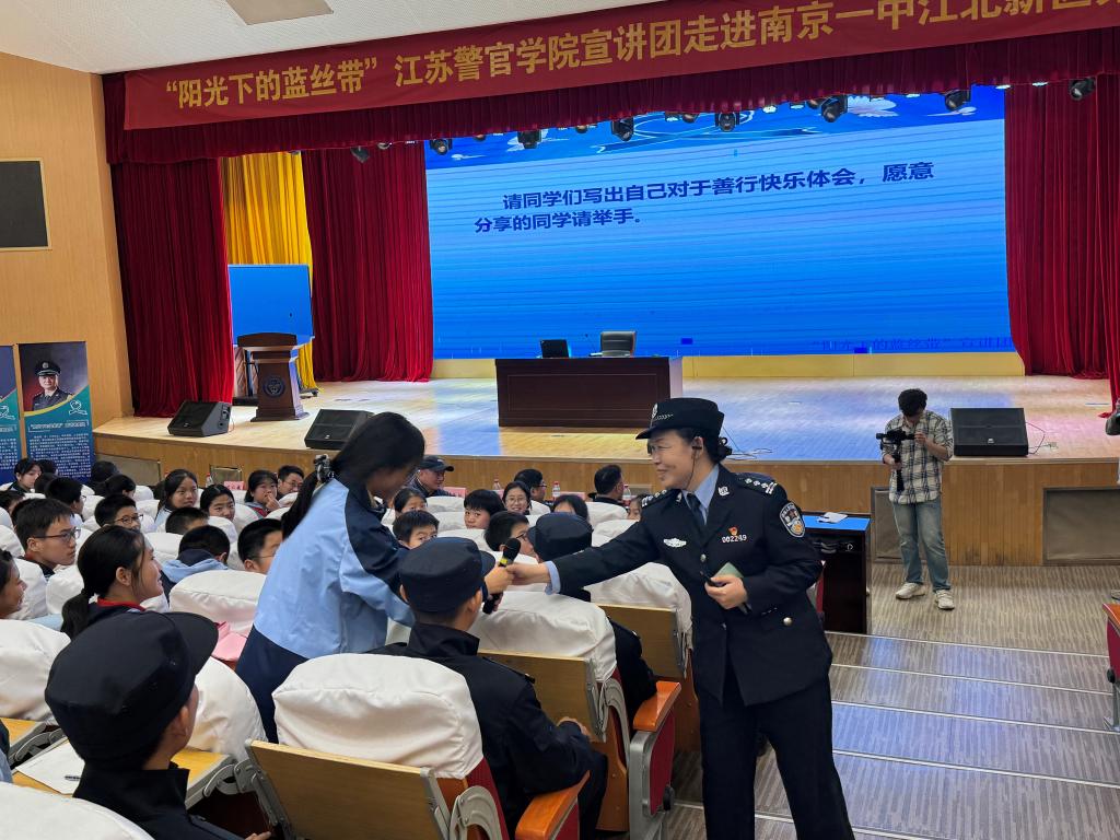 江苏警官学院2024级刑事技术1区队50名大学生是本次宣讲活动的亮点,大学生代表赵洁如说:“宣讲活动意义非凡,让我受益匪浅。无论是列队行进过程中,孩子们低声的赞叹羡慕,还是报告厅孩子们热情的掌声,都让我增加了对自己警察身份强烈的认同感和自豪感。报告厅里涌动着同学们高涨的热情,深深地感染着我们,大家一起明悟法律对我意义、体悟善行的快乐、重温学习的初心。这实在是一次不可多得的宝贵体验!”