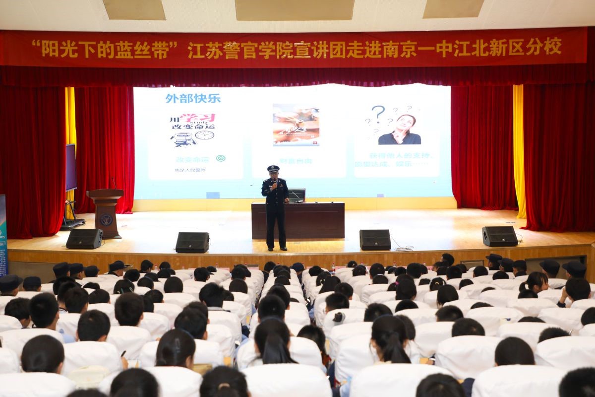 活动开始前,“阳光下的蓝丝带”江苏警官学院治安系宣讲团成员和应邀参加活动的嘉宾以及南京一中江北新区分校初二年级的330名师生在报告厅举行隆重的升国旗、奏唱国歌仪式。随后,大家观看了《与党同心 为国而生》江苏警官学院的宣传片,从建校之初的艰辛与热血,到一代代师生传承使命的坚定身影,每一个场景都仿佛带着岁月的回响。大家都沉浸其中,被宣传片中展现出的深厚底蕴和伟大抱负深深打动。