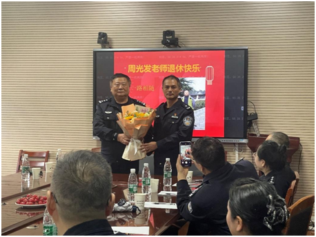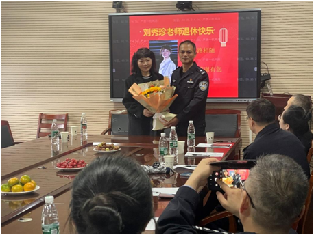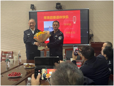 下半年基础部有三位党员教师到达退休年龄。党总支组织了简朴而又隆重的退休纪念活动。由常青同志领誓,全体人员郑重重温入党誓词。之后大家向三位党员送上鲜花和祝福,表示敬意。常青、周光发和刘秀珍三位同志分别从学生管理、课程教学与综合服务三个方面深情回顾了自己的公安教育职业生涯,对党组织的关心培养表示了真挚感谢。三位老党员分享的故事内容朴实、情真意切,引导其他党员继续发扬基础部优良传统,铭记无私奉献的校风,坚定不移听党话、跟党走。
