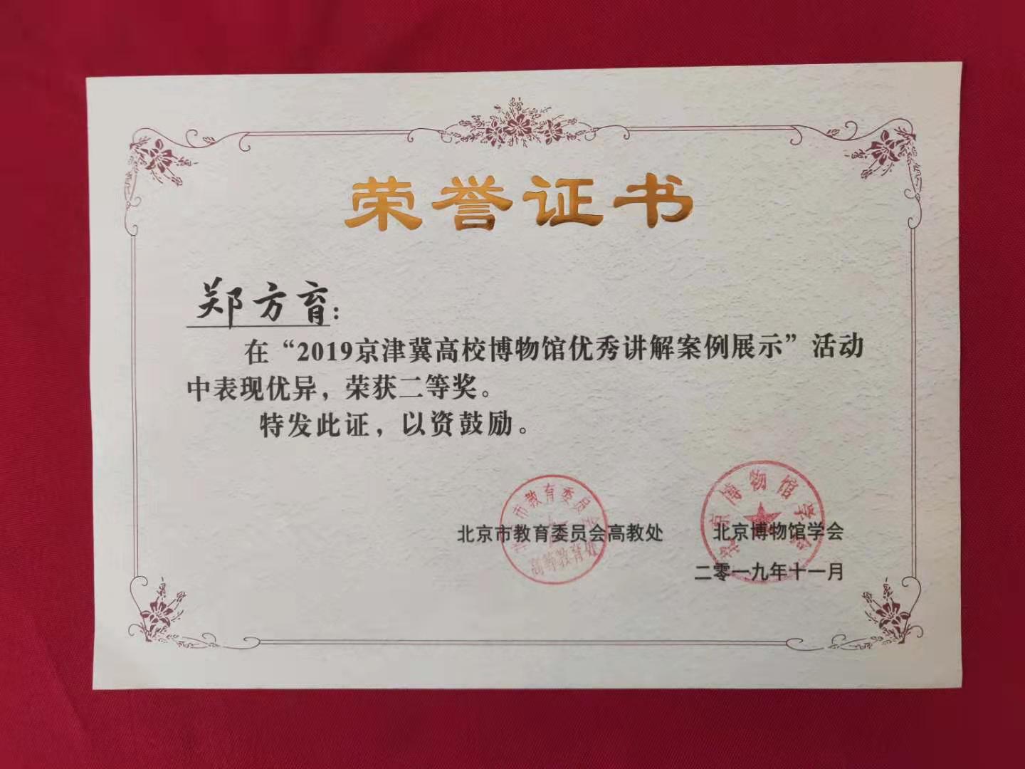 11月20日,“第五届中国高校博物馆馆长论坛暨2019京津冀高校博物馆优秀讲解案例展示活动”颁奖仪式在中国传媒大学举行。经过激烈角逐和专家评选,我院博物馆志愿者、刑事科学技术系2017级郑方育同学荣获大赛二等奖。