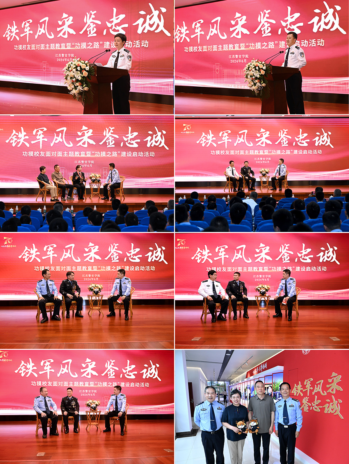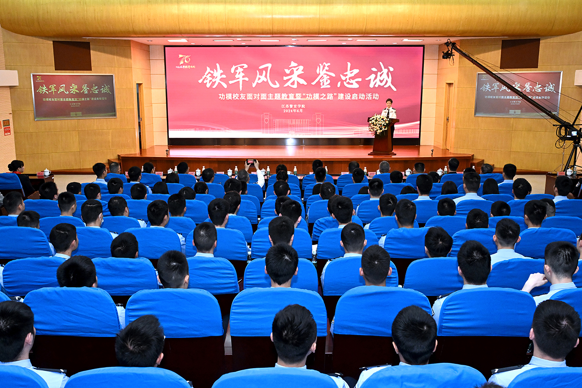 为深入学习贯彻习近平总书记关于思政课建设的重要论述,落实公安部和省公安厅党委关于公安政治工作服务保障公安工作现代化工作部署,教育引导学院师生对标先进、见贤思齐,传承红色基因,弘扬英模精神,筑牢忠诚警魂,6月6日下午,学院举办“铁军风采鉴忠诚”功模校友面对面主题教育暨“功模之路”建设启动活动,省市公安机关18名高等级荣誉功模校友应邀参加活动。省公安厅党委委员、学院党委书记夏存喜,学院党委副书记、院长黄进看望功模校友,学院党委副书记陈卫,副院长、政治部主任张敏参加活动,学院党委委员缪文升主持活动。